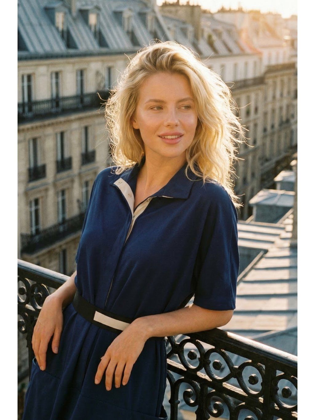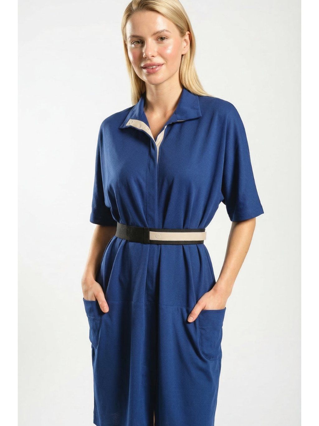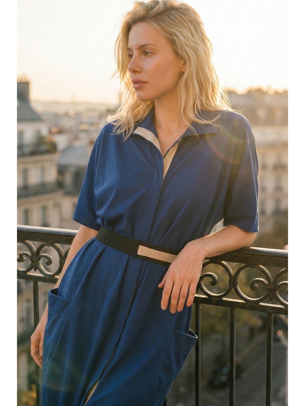 Modré zapínacie šaty Symi zaujmú najmä praktickými vreckami a kontrastným lemom na zapínaní. Voľnejší strih a rukávy zaručujú pohodlie a voľnosť pohybu. Pás je možné jednoducho zvýrazniť pásikom, čím šaty lichotia postave a vytvárajú elegantnú siluetu. Dĺžka šiat siaha približne po kolená – fotené na modelke s výškou 180 cm.
