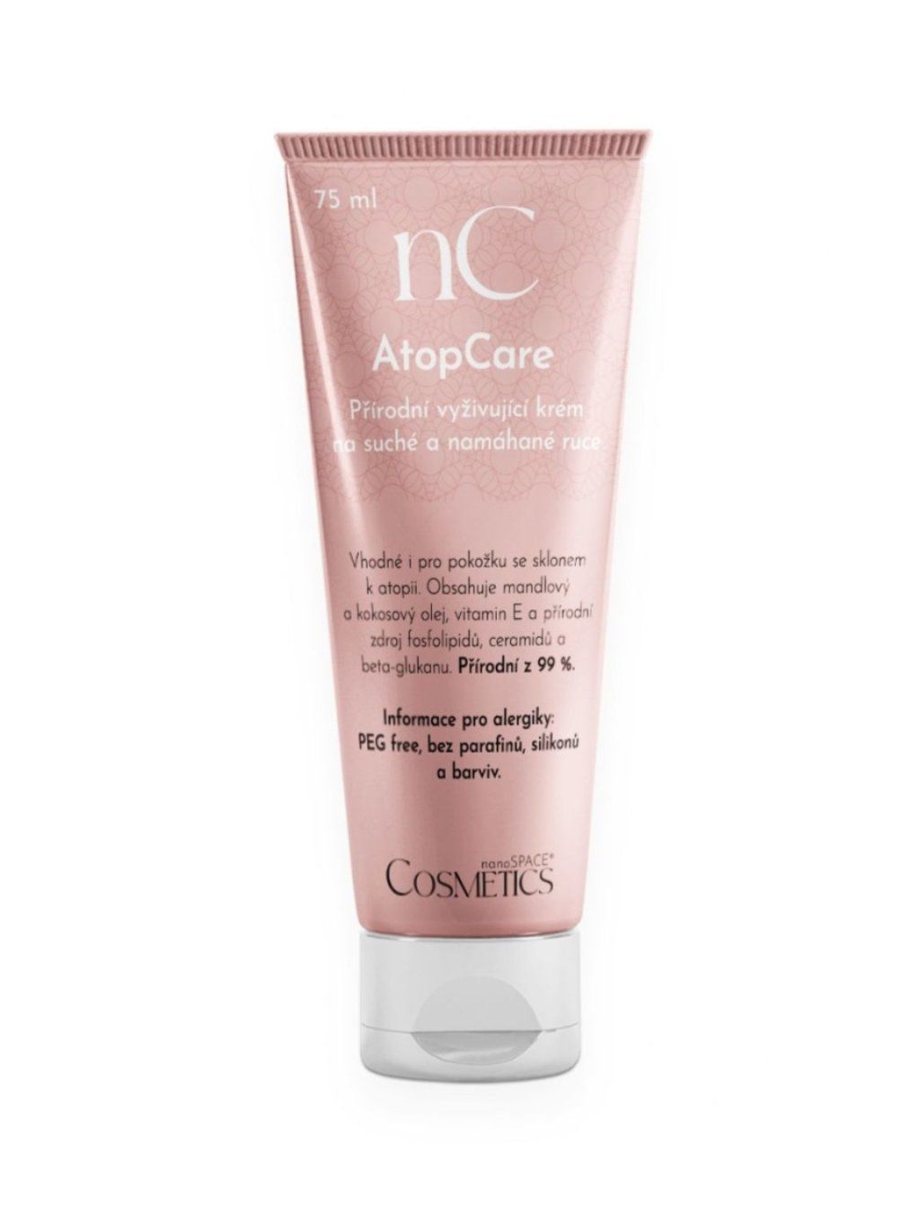 Intenzivně vyživující krém na suché a namáhané ruce AtopCare nanoSPACE Cosmetics je vhodný pro péči o pokožku s projevy atopické dermatitidy ale i pro všechny, kdo mají velmi citlivou pokožku, trpí alergiemi, nebo mají extrémně suché ruce. Obsahuje přírodní složky, které jsou známé svými zklidňujícími a protizánětlivými vlastnostmi, jako je extrakt z ovsa a včelí vosk. Tyto složky pomáhají pokožku hydratovat a tlumí nepříjemný pocit svědění. Krém neobsahuje žádné dráždivé nebo alergenní složky.